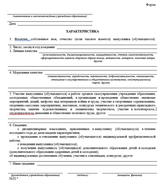 - характеристика, выданная учреждением общего среднего образования либо учреждением, реализующим образовательные программы профессионально-технического или среднего специального образования для лиц, получивших соответствующее образование в год приема, по форме, устанавливаемой Министерством образования