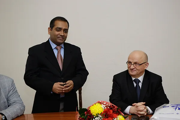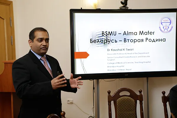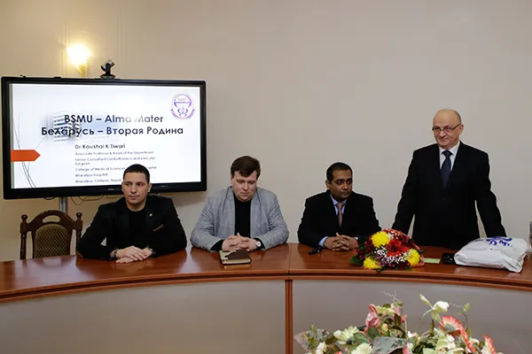 Открывая встречу, ректор БГМУ Сикорский А.В. сказал: «Мы очень рады снова видеть Вас, доктор Каушал Тивари, в стенах нашего университета. Вы окончили один из лучших медицинских университетов Беларуси и хорошо знаете нашу республику, так как Вы здесь жили и учились, здесь встретили свою половинку. И теперь у Вас интернациональная семья, двое детей. Вы состоялись как специалист, достигли высот в своей профессии и сегодня достойно представляете белорусскую медицинскую школу за рубежом. Мы гордимся Вами, доктор Каушал, и благодарим за то, что Вы не забываете родной вуз и поддерживаете с ним отношения. Вам слово.»
