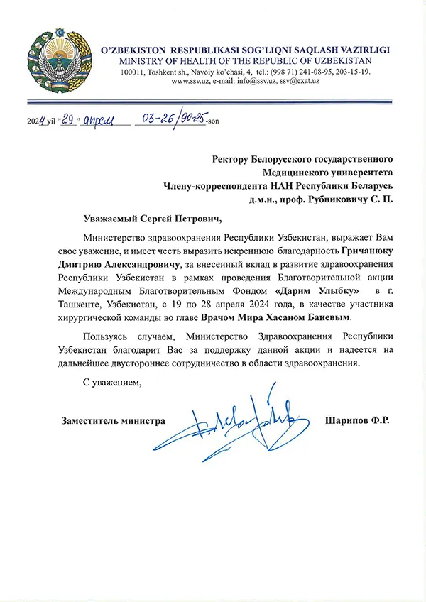 От имени Министерства здравоохранения Республики Узбекистан Дмитрию Александровичу Гричанюку была выражена благодарность за вклад в развитие здравоохранения этой страны.