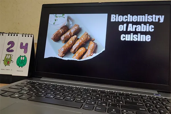 В преддверии нового учебного семестра студенты групп 6225а и 6229а вместе с преподавателем кафедры биологической химии Екатериной Хотько вспомнили незаменимые факторы питания, повторили основные метаболические пути обмена углеводов, белков и липидов, разбираясь в составах арабских блюд.