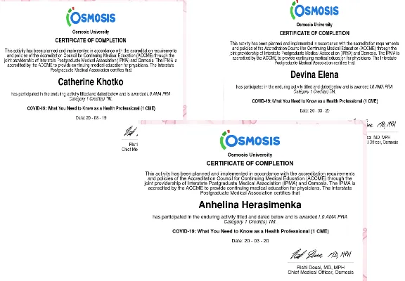 Чтобы достичь этих целей на кафедре биологической химии кураторы групп иностранных учащихся Е.А. Хотько, Т.Ю. Принькова, А.Г. Герасименко, Е.А. Девина и А.В. Колб прошли обучение в рамках экспресс-курса «COVID-19: What You Need to Know as a Health Professional (1 CME)» на онлайн-платформе Osmosis.org – одном из основных ресурсов, который регулярно обновляет текущую информацию, предоставляемую CDC, ВОЗ и другими ведущими агентствами. Всеми кураторами, принявшими участие в образовательной программе, получен соответствующий сертификат.