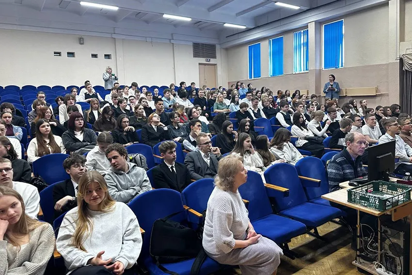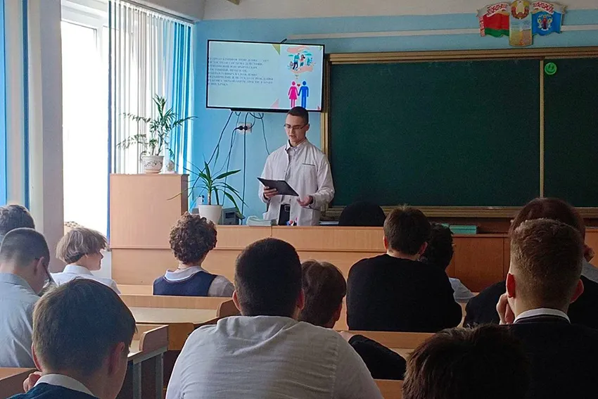 27 февраля 2025 года в рамках информационно-образовательного проекта «ШАГ» в 9-11 классах УО «Гимназия №174» г. Минска прошли информационные часы на тему «Молодость – время выбора. Молодежь – за здоровый образ жизни». Студенты-волонтеры 3 курса медико-профилактического факультета, Арина Кореба и Валентина Липская (группа 3312), поделились своими знаниями и опытом с учащимися старших классов.