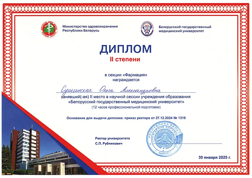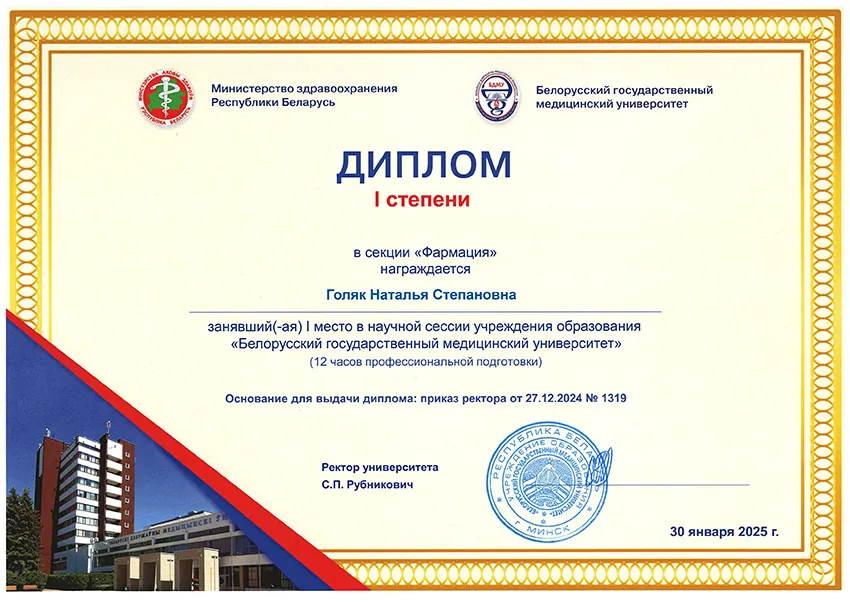 По результатам сессии заведующему кафедрой Наталье Степановне Голяк был присужден диплом I степени, старшему преподавателю Ольге Александровне Сушинской – диплом II степени. Диплом победителю торжественно вручил на пленарном заседании сессии ректор Белорусского государственного медицинского университета, член-корреспондент НАН, доктор медицинских наук, профессор Сергей Петрович Рубникович.