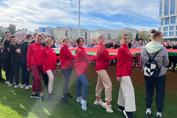 Ребята весело потанцевали под зарядку гимнасток Белорусского государственного университета физической культуры, получили мастер-класс от игроков футбольного клуба «Динамо-Минск», а после растянули главные символы страны и столицы – их флаги.