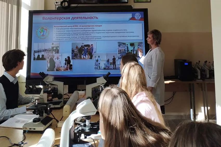 В рамках профориентационной деятельности кафедра морфологии человека БГМУ совместно с факультетом профориентации и довузовской подготовки организовала серию мероприятий для учащихся гимназии № 41 г. Минска. Старший преподаватель Ирина Мащенко провела профориентационную беседу «Мы выбираем БГМУ», в ходе которой подробно рассказала школьникам об университете, его традициях, возможностях обучения и, в частности, о стоматологическом факультете. Школьники проявили живой интерес и задавали много вопросов о поступлении, учебной нагрузке, студенческой жизни и перспективах будущей профессии.