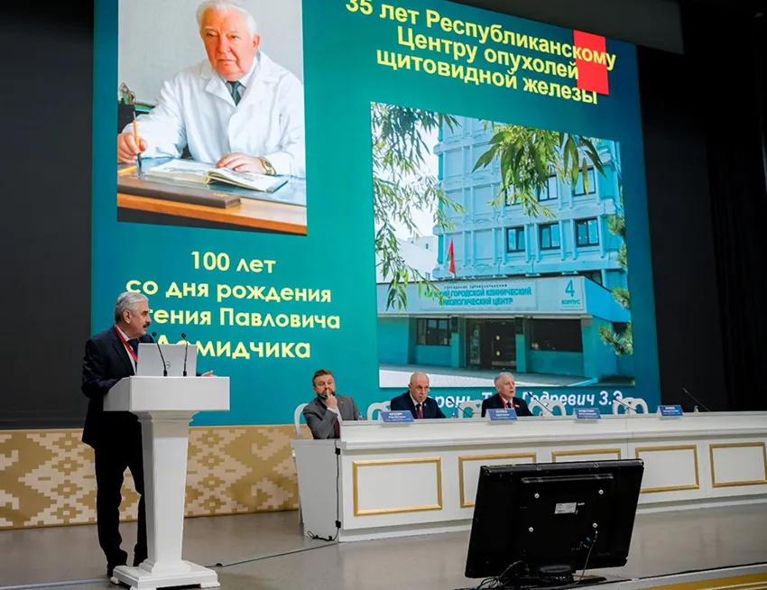 Конференция началась с доклада «Евгений Павлович Демидчик – 100 лет со дня рождения. Создание Республиканского центра опухолей щитовидной железы», который представила старший преподаватель кафедры онкологии с курсом повышения квалификации и переподготовки БГМУ Тамара Корень.