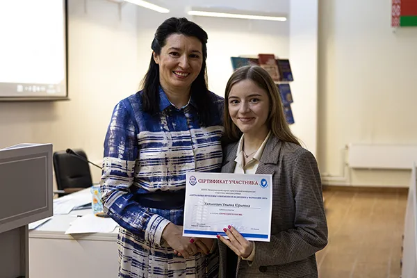 Диплом II степени: Лазеротерапия в периодонтологии. Клинический случай применения лазера в комплексе со скейлингом и корневым сглаживанием при лечении воспалительно-деструктивных процессов в периодонте. Автор: Лихута Анастасия Сергеевна (БГМУ, стомфак, 7417 гр.). Руководитель: канд. мед. наук, доц. Урбанович Валентина Иосифовна.