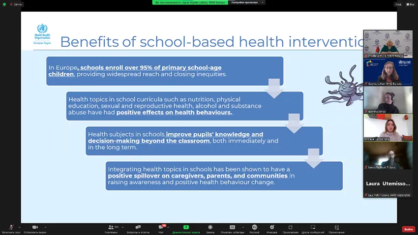 Целью совещания было оказать поддержку государствам-членам в переходе к непосредственному внедрению подхода «Школы, содействующие укреплению здоровья». Мероприятие проводилось в контексте инициативы «Здоровый старт здоровой жизни: стратегия охраны здоровья и благополучия детей и подростков». В совещании приняло участие более 150 человек – это национальные координаторы из министерств здравоохранения и образования всех 53 государств-членов, а также ключевые партнеры и заинтересованные стороны, работающие в сфере охраны здоровья и благополучия детей школьного возраста.