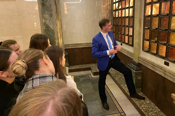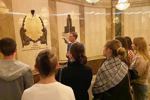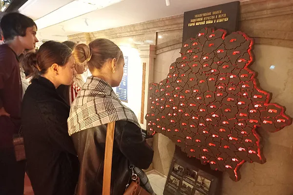 Экскурсия участников студенческого отряда имени профессора Б. Я. Эльберта началась в крипте храма. Здесь продумана каждая деталь, начиная с входных дверей. Шесть эмблем, изображенных на ней, называют «Слезы Беларуси». Дальше крипта – своеобразное сердце храма. В ее стенах 524 специальные ниши. Постепенно они заполняются капсулами, в которых хранится земля с тех исторических мест, где массово трагически погибали белорусы. В мемориальных залах крипты отражены и события современной истории Беларуси: Чернобыль, трагедия на Немиге, теракт в метро.