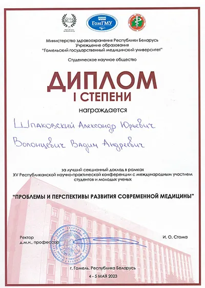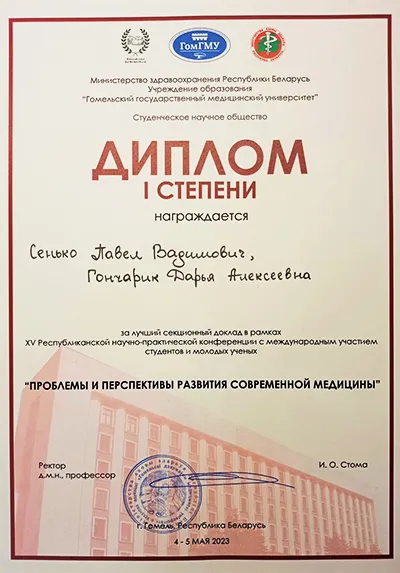 На секции «Медико-биологические науки» курсантом военно-медицинского института Павлом Сенько и студенткой 3-го курса лечебного факультета Дарьей Гончарик под началом старшего преподавателя кафедры патологической физиологии Екатерины Шуляк была представлена научная работа по теме «Нейрофиброматоз: этиопатогенез и клинические проявления на примере клинических случаев», которая принесла победу и была отмечена дипломом I степени.