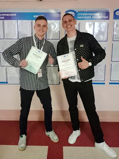 Представленная на секции «Патологическая физиология» научная работа «Частота атрофических изменений головного мозга по данным результатов компьютерной томографии в зависимости от возраста и пола пациентов», подготовленная студентами 3-го курса лечебного факультета Белорусского государственного медицинского университета Александром Шпаковским и Вадимом Волонцевичем под научным руководством старшего преподавателя кафедры патологической физиологии Сергея Чепелева, была удостоена диплома I степени.