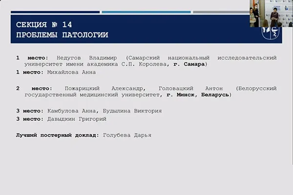 Программа конференции включала проведение 21 секции и пленарного заседания. Студенты 4-го курса лечебного факультета Александр Пожарицкий и Антон Головацкий под научным руководством заведующего кафедрой патологической физиологии Белгосмедуниверситета, члена-корреспондента НАН Беларуси, заслуженного деятеля науки Республики Беларусь, доктора медицинских наук, профессора Франтишека Ивановича Висмонта представили свою научную работу «Механизмы развития гипергликемии у пациентов с COVID-19-инфекцией и сопутствующей сердечно-сосудистой патологией» на секции «Проблемы патологии», где были рассмотрены 14 устных и 8 постерных докладов.
