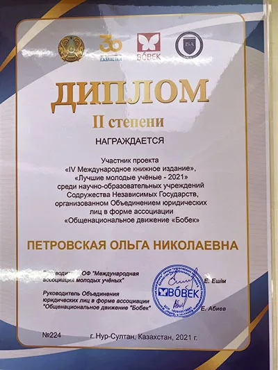 Аспирант кафедры общей гигиены Белорусского государственного медицинского университета, старший преподаватель Ольга Николаевна Петровская приняла участие в проекте «Лучшие молодые ученые – 2021», который проводился среди научно-образовательных учреждений Содружества Независимых Государств и был организован Объединением юридических лиц в форме ассоциации «Общенациональные движения «Бобек» (город Нур-Султан, Казахстан).