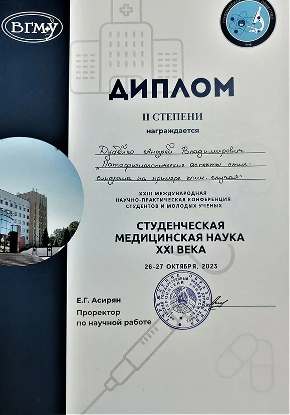 На заседании секции «Медико-биологические науки» студент 4-го курса лечебного факультета Белорусского государственного медицинского университета Андрей Дубейко под научным руководством старшего преподавателя кафедры патологической физиологии Екатерины Васильевны Шуляк представил реферативный доклад «Патофизиологические аспекты стил-синдрома на примере клинического случая», который был удостоен диплома II степени.