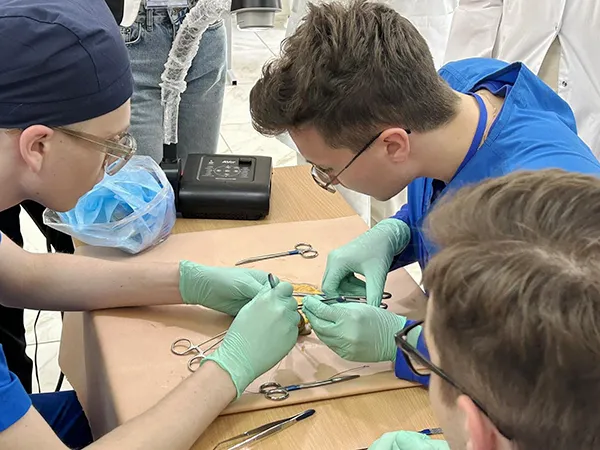 Перед началом каждого из мастер-классов будущие хирурги рассказали о ходе проведения оперативного вмешательства, основных этапах, показаниях и противопоказаниях, а также о технике операции с использованием интерактивной доски. Следует отметить, что студенты-хирурги были младших курсов (1–4), но, несмотря на это, уже владели техникой хирургических манипуляций.
