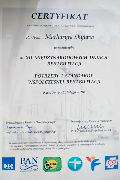 20-21 февраля 2020 года в городе Жешуве (Подкарпатское воеводство, Республика Польша) состоялась Международная конференция «XII Międzynarodowе Dni Rehabilitacji 2020: Potrzeby i standard wspolczesnej rehabilitacji» («XII Международные дни реабилитации: потребности и стандарты современной реабилитации»). Организаторами данной конференции выступили Национальное общество реабилитологов Польши, Жешувский университет, Комитет реабилитации, физической культуры и социальной интеграции Польской академии наук. В конференции приняли участие исследователи из Польши, Словакии, Германии, Украины, Беларуси. На пленарном и секционных заседаниях было представлено 69 устных и 37 стендовых докладов, посвященных состоянию проблемы и перспективам развития реабилитации и профилактики социально значимых болезней.