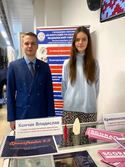 2. Владиславом Кончаком, студентом 6-го курса лечебного факультета –«Spoonfeeder 2.0 – устройство для кормления пациентов с патологией челюстно-лицевой области». Оно позволяет решить проблему питания пациентов с челюстно-лицевой патологией различной этиологии, осложненной ограничением открывания рта, как в процессе амбулаторного и стационарного лечения, так и в период послеоперационной реабилитации, в том числе после реконструктивных и ортогнатических операций. Устройство может использоваться или пациентом cамостоятельно, или медицинским работником стационара, осуществляющего кормление.