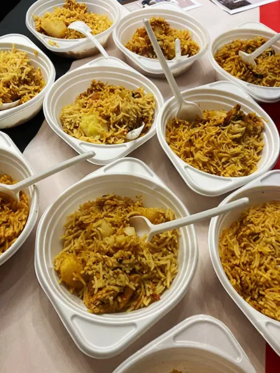 Одним из традиционных блюд считается капса. Это блюдо напоминает пропаренный рис с большими кусочками мяса. Его приготовили от души в большом количестве, чтобы хватило всем желающим, и позаботились доставить его горячим. Особенностью являлось добавление пряных специй и соуса сахауек зеленоватого цвета, который придает приятную остроту и очень понравился всем, кто угостился данным блюдом.