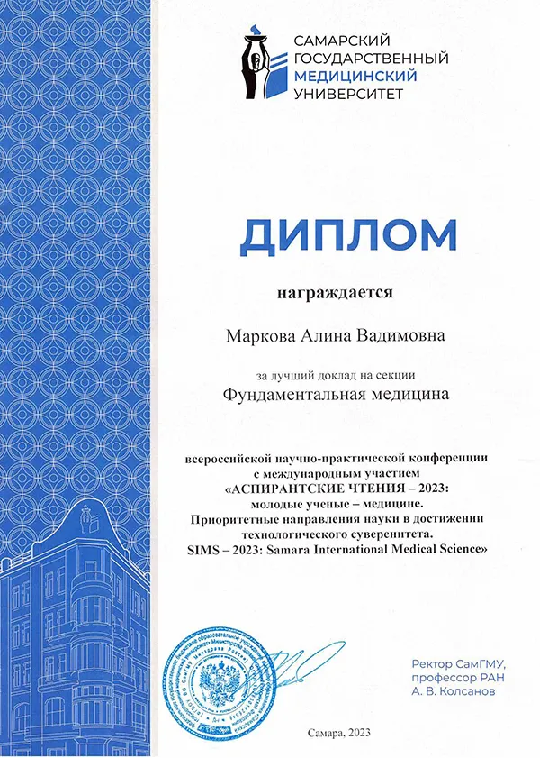 Призового диплома удостоена студентка БГМУ на Всероссийской научно-практической конференции «Аспирантские чтения – 2023»