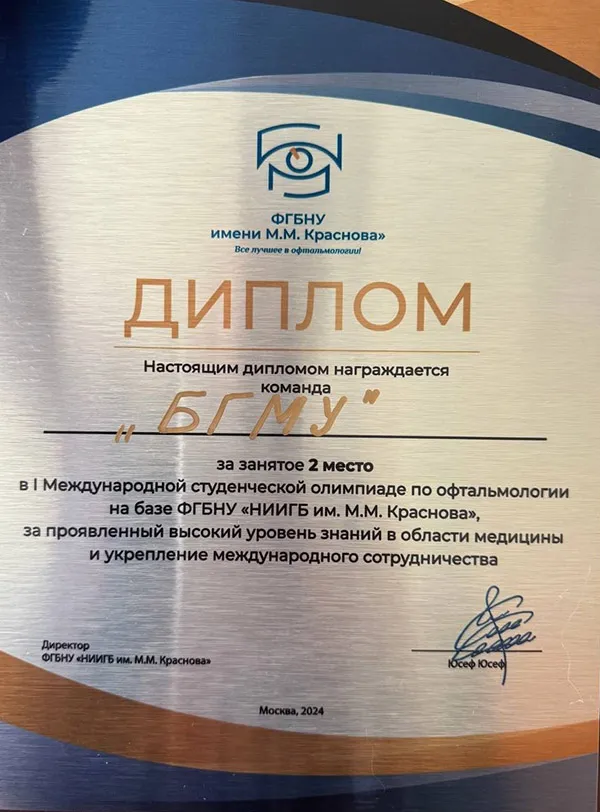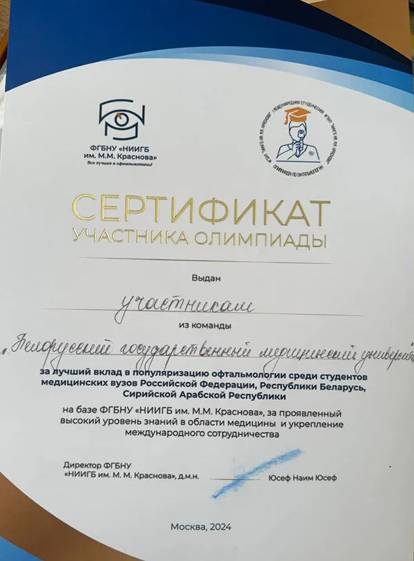 23 мая в стенах Федерального государственного бюджетного научного учреждения «Научно-исследовательский институт глазных болезней имени М. М. Краснова» (Москва) была проведена I Международная студенческая олимпиада по офтальмологии, в которой принимала участие и команда Белорусского государственного медицинского университета.