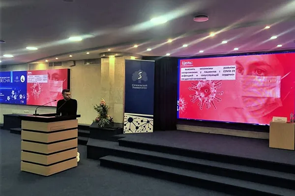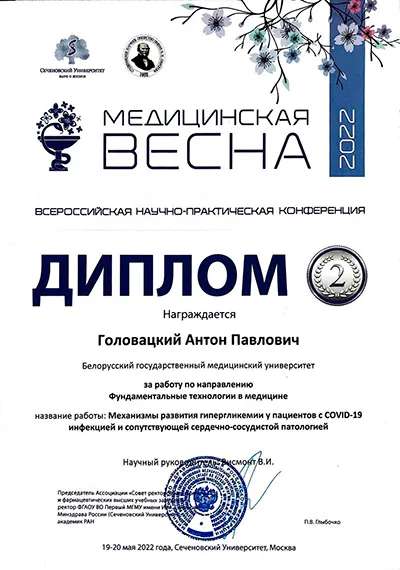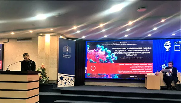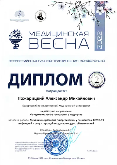. Студенты 4-го курса лечебного факультета Александр Пожарицкий и Антон Головацкий получили приглашение очно принять участие в работе секции «Фундаментальные технологии в медицине» с научным докладом «Механизмы развития гипергликемии у пациентов с COVID-19-инфекцией и сопутствующей сердечно-сосудистой патологией», подготовленным на кафедре патологической физиологии Белорусского государственного медицинского университета под научным руководством заведующего кафедрой, заслуженного деятеля науки Республики Беларусь, члена-корреспондента НАН Беларуси, доктора медицинских наук, профессора, Франтишка Ивановича Висмонта.