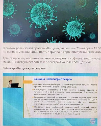 23 ноября в Белорусском государственном медицинском университете был организован и проведен онлайн-вебинар по вакцинопрофилактике гриппа и коронавирусной инфекции для руководителей вузов/ссузов, кураторов проекта «Вакцина для жизни» от учреждений высшего и среднего специального образования, студентов. К семинару были подключены профильные отделы министерств здравоохранения и образования, Минский городской ЦГЭ, Минский горисполком и кураторы проекта от центров гигиены и эпидемиологии столицы.