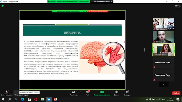 15 докладов. Выступления участников проходили в онлайн-режиме на платформе Zoom. С приветственным словом к участникам обратилась заведующий кафедрой патологической физиологии Смоленского государственного медицинского университета, кандидат медицинских наук, доцент Ольга Владиславовна Халепо.