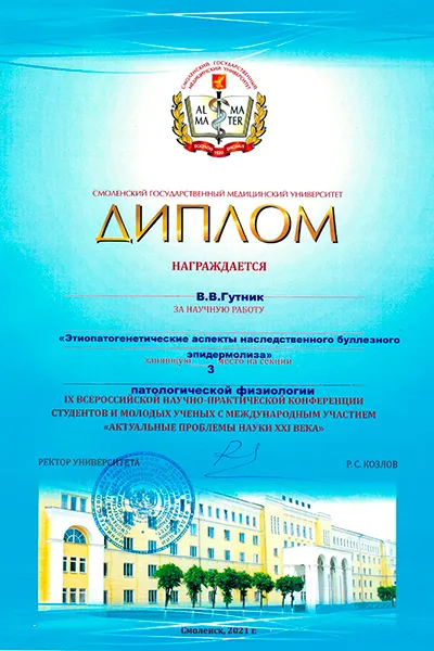 Студентка 5-го курса лечебного факультета Ванесса Гутник на секцию «Патологическая физиология» вынесла работу «Этиопатогенетические аспекты наследственного буллезного эпидермолиза», выполненную под научным руководством старшего преподавателя кафедры патологической физиологии Белорусского государственного медицинского университета Сергея Николаевича Чепелева. Всего на данной секции было представлено