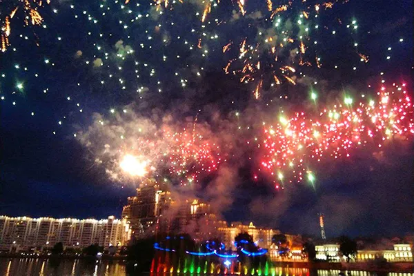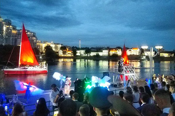 Виновников торжества ждала разнообразная концертная программа, которую сопровождал Президентский оркестр. Ну а ее финальным аккордом стали красивое водное шоу «Алые паруса» (которые символизируют волю, исполнение желаний и стремление к их воплощению, чистоту помыслов) и фейерверк.