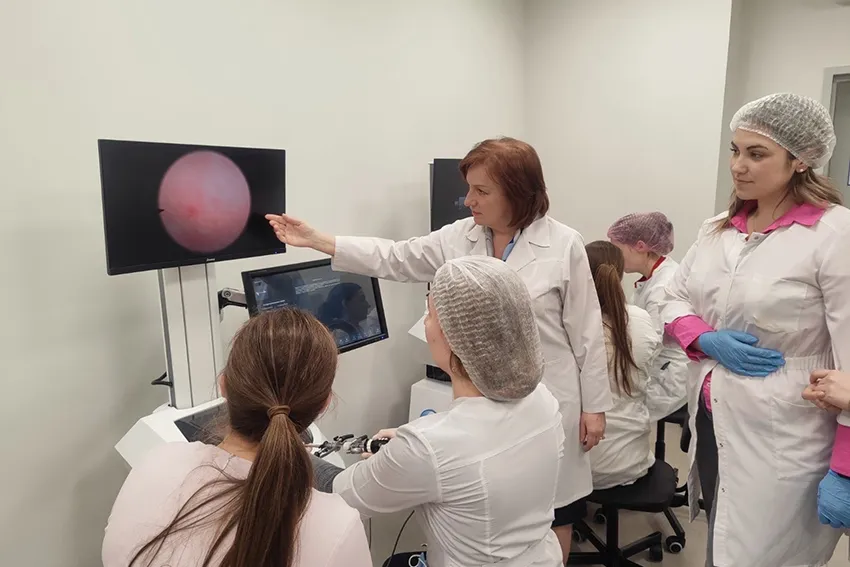 Значимой частью мероприятия стали мастер-классы, которые предоставили уникальную возможность врачам-интернам и клиническим ординаторам кафедры акушерства и гинекологии с курсом повышения квалификации и переподготовки применить теорию на практике. На одном из мастер-классов рассматривалась гистероскопия – метод диагностики и лечения заболеваний матки. Участники получили возможность изучить технику проведения процедуры и обсудить с опытными специалистами сложные клинические случаи.
