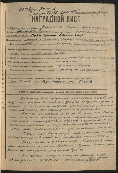 На сайте «Партизаны Беларуси» опубликован наградной лист М.М. Владысика. Приводим его текст.