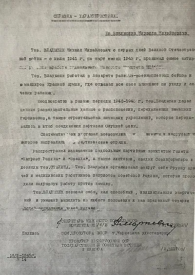 Из справки-характеристики М.М. Владысика, написанной членом Минского подпольного комитета КП/б/Б А. Маркевичем: «Тов. Владысик Михаил Михайлович с первых дней Великой Отечественной войны – с июля 1941 г. по март 1943 г. принимал самое активное участие в работе подпольного Минского Комитета КП/б/Б…