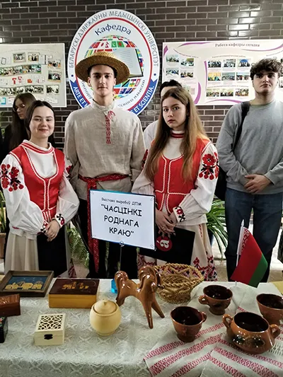 Экспазіцыю складалі вырабы ганчарства, лоза- і саломапляцення, мастацкай апрацоўкі дрэва і металу, ткацтва, вышыўка і выцінанка. У падрыхтоўцы калекцыі мастацкіх вырабаў прынялі ўдзел выкладчыкі кафедры і навучэнцы. Экскурсію для наведвальнікаў правялі студэнты стаматалагічнага факультэта Настасся Мішко, Багдан Праскаловіч, Ганна Лапчак і Марыя Пацкевіч.