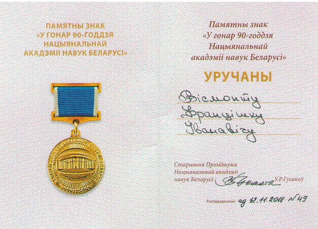 Памятным знаком «У гонар 90-годдзя Нацыянальнай акадэміі навук Беларусі» (2018 г.).