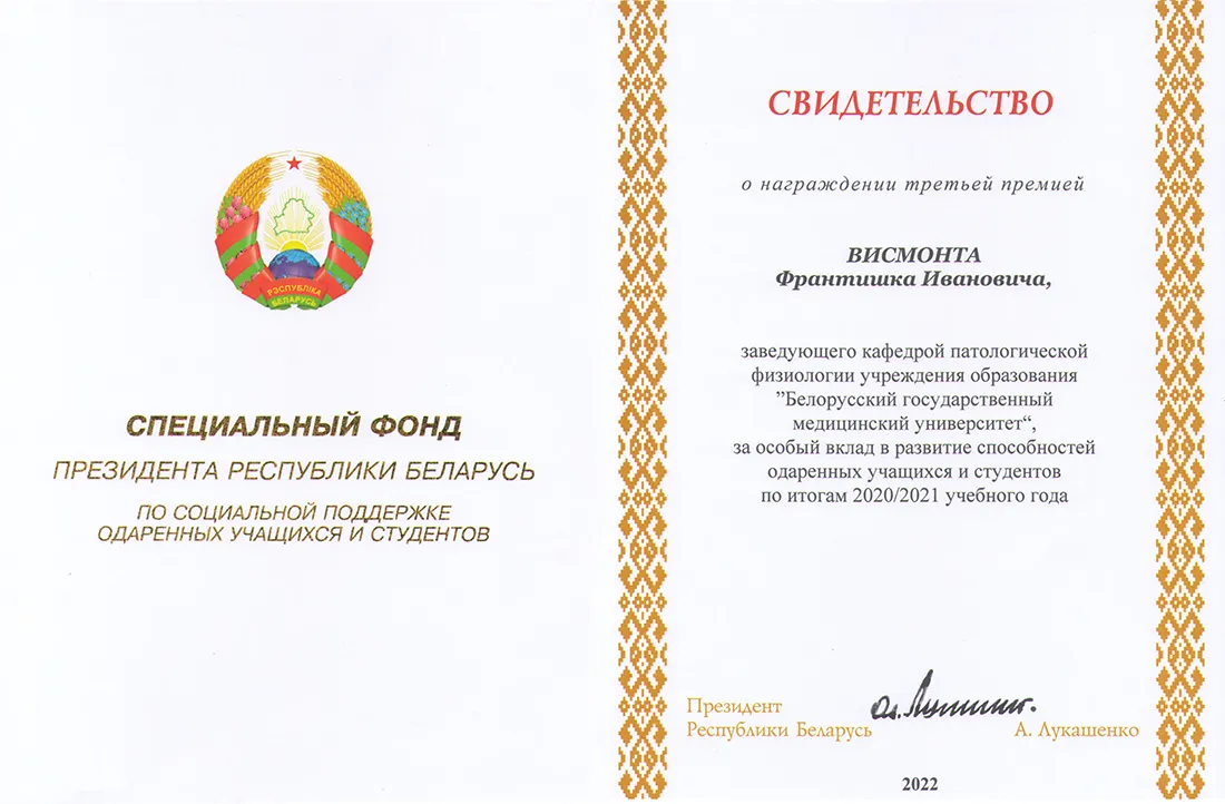 Ф.И.Висмонт является одним из ведущих специалистов Беларуси в области физиологии и патологии. Известный ученый в области основ жизнедеятельности здорового и больного организма человека. Под его руководством защищено 11 диссертаций, одна из которых на соискание ученой степени доктора медицинских наук.