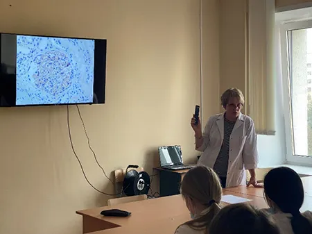 В работе кружка кафедры внутренних болезней, кардиологии и ревматологии с курсом повышения квалификации и переподготовки используются технологии медисциплинарного и межкафедрального взаимодействия с проведеним отдельных совместных заседаний студенческих научных кружков с другими кафедрами БГМУ. На одном из таких заседаний с кафедрой патологической анатомии студенты ознакомились с работой диализных залов отделения нефрологии и гемодиализа ГУ «МНПЦ хирургии, трансплантологии и гематологии», прослушали ряд сообщений о нефрологических проблемах современной медицины, осмотрели пациентов с почечной патологией и разобрали клинические случаи с высокопрофессиональной интерпретацией морфологических препаратов, полученных при проведении нефробиопсии, доцентом, кмн Дмитриевой Маргаритой Владимировной.