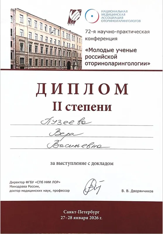 На 72-й научно-практической конференции «Молодые ученые российской оториноларингологии», которая состоялась в Санкт-Петербурге 27-28 января, её исследовательская работа «Современные парадигмы в диагностике и лечении паратонзиллярного абсцесса в педиатрической популяции: интеграция клинических данных и международного опыта» была удостоена диплома II степени.