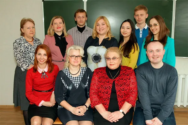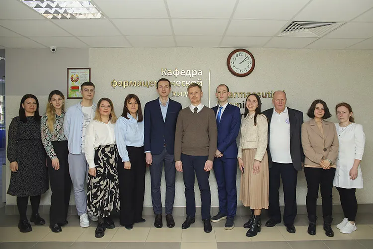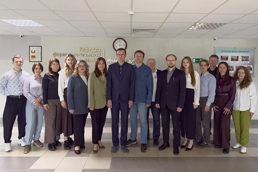 Состав кафедры фармацевтической химии с курсом повышения квалификации и переподготовки в 2025 году. Слева направо: препаратор Кузюта Я.А., лаборант Мартынова Е.С., лаборант 1-ой категории Акулич Д.А., ведущий лаборант/ассистент Казаченко М.А., старший преподаватель Михайлова Н.И., старший преподаватель Борабанова Н.М., заведующий кафедрой Лукашов Р.И., доцент Хаминец С.Г., доцент Беляцкий В.Н., лаборант 1-ой категории Данченко А.Д., преподаватель-стажёр Босая А.А., препаратор Кладиев А.А., доцент Горбацевич Г.И., ассистент Терлецкая В.А., старший преподаватель Мандрик Н.И.