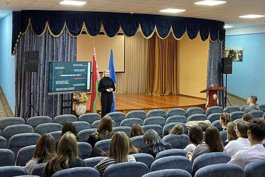 25.11.2024 в ГУО «Боровлянская гимназия» при участии волонтера кафедры гигиены и охраны здоровья детей с курсом ПКиП, студента 3406 гр. медико-профилактического факультета Папушой Алины Алексеевны была проведена профилактическая беседа среди обучающихся 9-11 классов на тему: «Профилактика психоэмоционального неблагополучия и стрессоустойчивость организма».