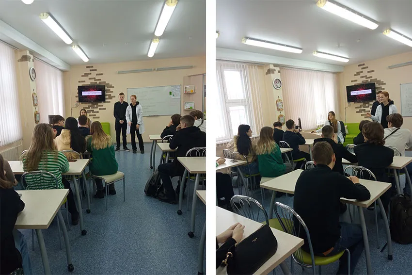 18.11.2024 в рамках проекта «Медицинские классы!» на базе ГУО «Гимназия № 39 г. Минска» при участии волонтеров кафедры гигиены и охраны здоровья детей с курсом ПКиП, студентов групп 3305 и 3306 медико-профилактического факультета Ревуцкой Яны Петровны и Зновец Александры Сергеевны была проведена тематическая лекция-дискуссия среди обучающихся 8-9 классов на тему: «Вейпинг. Профилактика употребления спайсов. Опасность для здоровья».
