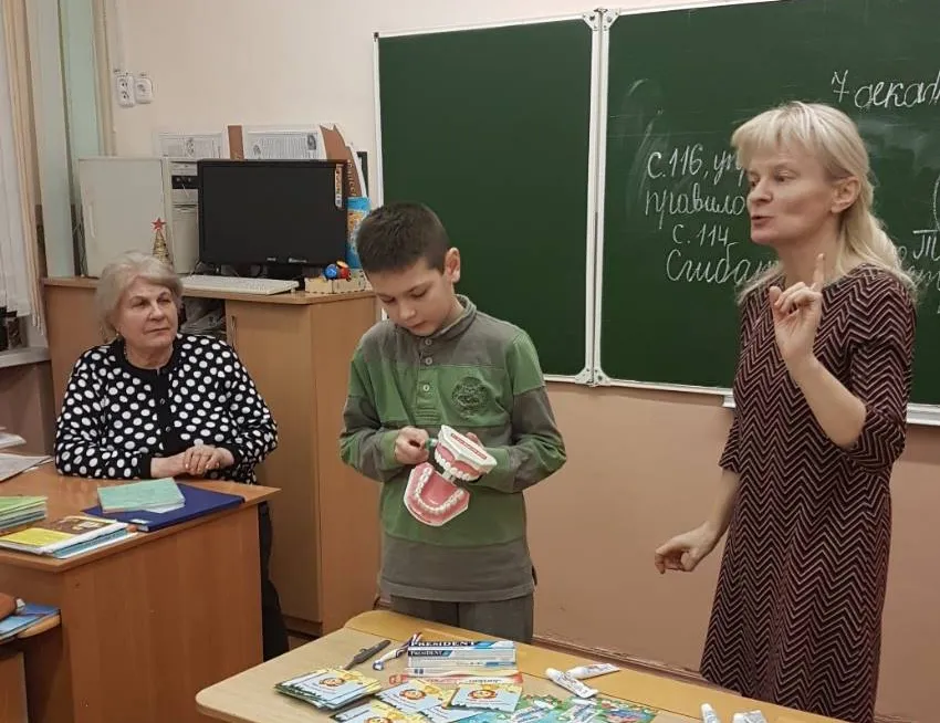 Сотрудники кафедры проводят занятия по индивидуальной гигиене ротовой полости со школьниками