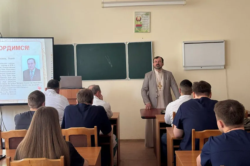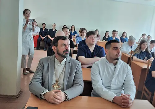 Перед молодежью выступил настоятель прихода в честь святителя Луки Войно-Ясенецкого, архиепископа Симферопольского, отец Виктор Резанович. Святой Лука, профессор, хирург, патологоанатом хорошо известен медицинскому сообществу. Студенты БГМУ были при освящении места для строительства храма в честь святителя Луки. Кафедра и клиника сотрудничает с отцом Виктором. Совместно проводились конференции, посвященные святителю и профессору-хирургу Войно-Ясенецкому. Отец Виктор в своем выступлении рассказал о роли священников в ВОВ, о важности знания истории ВОВ, о защите духовных и культурных ценностей нашего отечества.