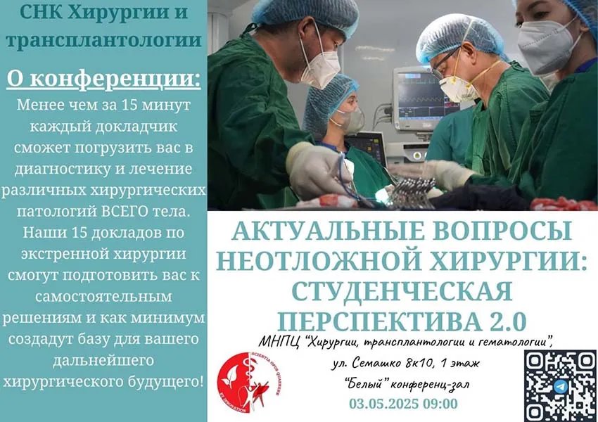 3 мая 2024 года студенты 4-6 курсов и кафедра Хирургии и трансплантологии проявили инициативу и провели студенческую конференцию "Актуальные вопросы неотложной хирургии: студенческая перспектива 2.0". Было представлено 15 докладов.