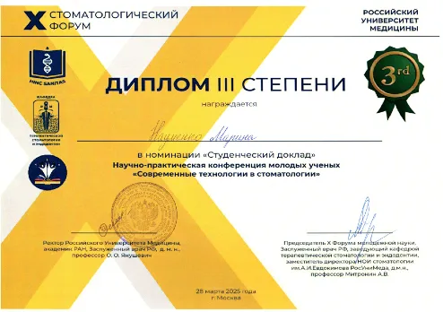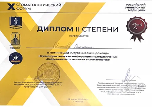 «Ингибированный кислородом слой: сравнительная оценка различных методов удаления с поверхности фотоотверждаемых композиционных материалов»; Шишкова Виолетта Игоревна, студентка 5 курса, с научной работой «Вкладки как альтернатива пломбировочным материалам в реставрационной терапии» под руководством Пстыга Екатерины Юрьевны, Коротковой Виктории Вячеславовны.