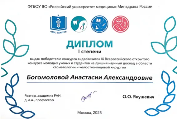 Студентка 5 курса стоматологического факультета Богомолова Анастасия приняла участие в IX Всероссийском открытом конкурсе молодых учёных и студентов на лучший научный доклад в области стоматологии и челюстно-лицевой хирургии.