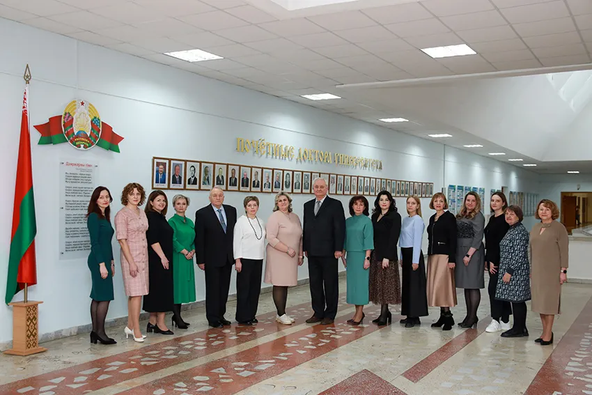 Второй ряд слева направо: проректор по воспитательной работе, доц. Манулик В.А., асс. Колб Е.Л., лаб. 2 кат. Волкова Н.Б., асс. Заточная В.В., проф. Артишевский А.А., доц. Большова Е.И., ст. преп. Китель В.В., доц. Анищенко С.Л., лаб. 2 кат. Жерко И.С., проректор по научной работе, проф. Кабак С.Л.