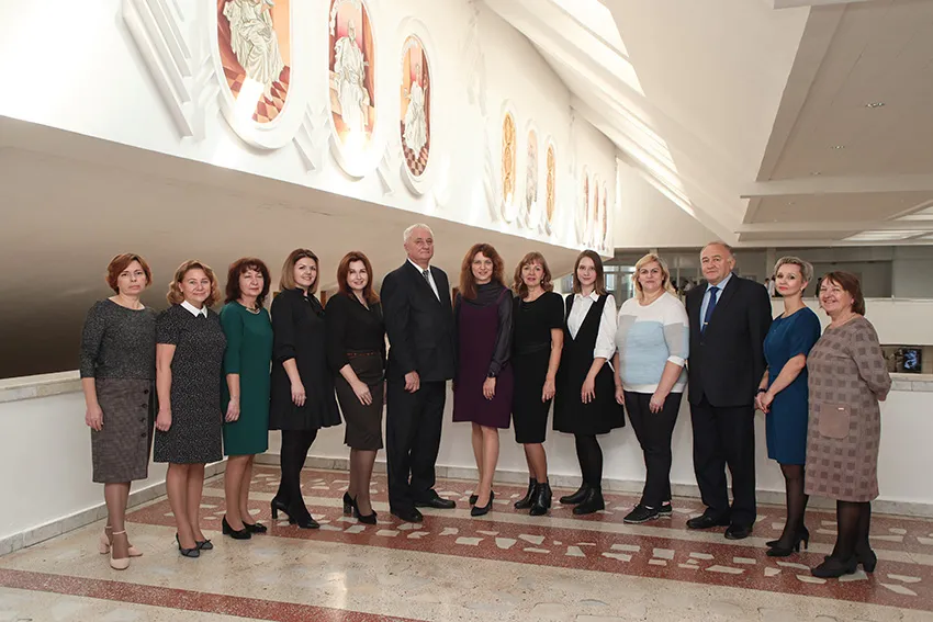 Слева направо: лаб. 2 кат. Журович Ж.Г., ст. преп. Китель В.В., лаб. 2 кат. Жерко И.С., асс. Мельниченко Ю.М., лаб. 2 кат. Волкова Н.Б., проф. Артишевский А.А., асс. Жарикова Н.А., проректор по научной работе, проф. Кабак С.Л., зав. кафедрой, доц. Синельникова Н.В., ст. преп. Юшкевич Е.В., доц. Большова Е.И., доц. Анищенко С.Л., проректор по воспитательной работе, доц. Манулик В.А.