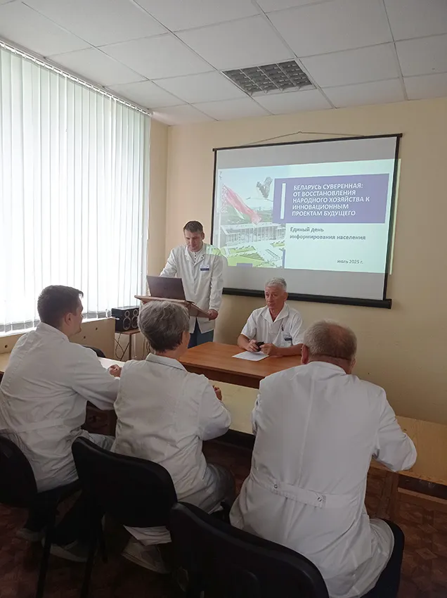 17.07.2025 доцент кафедры неврологии и нейрохирургии Селицкий М.М. провел с сотрудниками кафедры Единый день информирования по теме: «Беларусь суверенная: от восстановления народного хозяйства к инновационным проектам будущего».