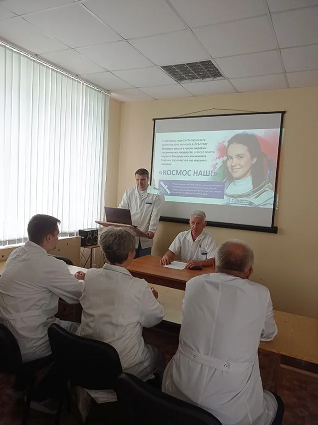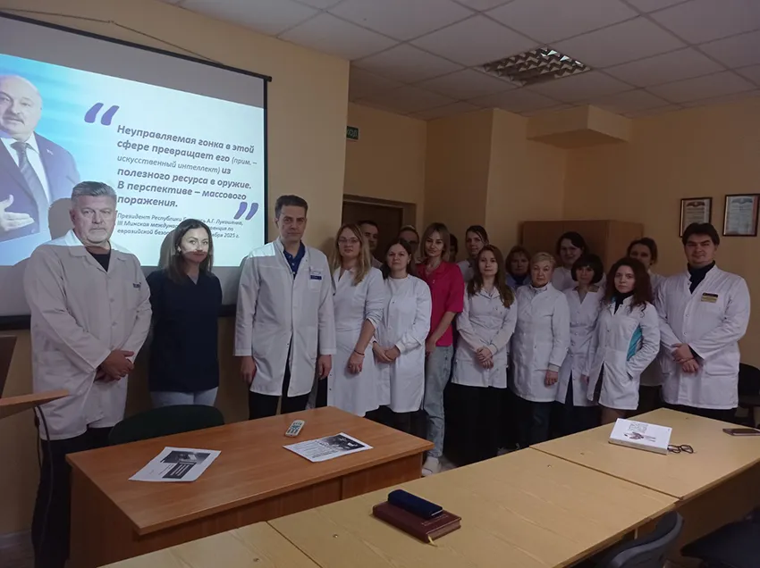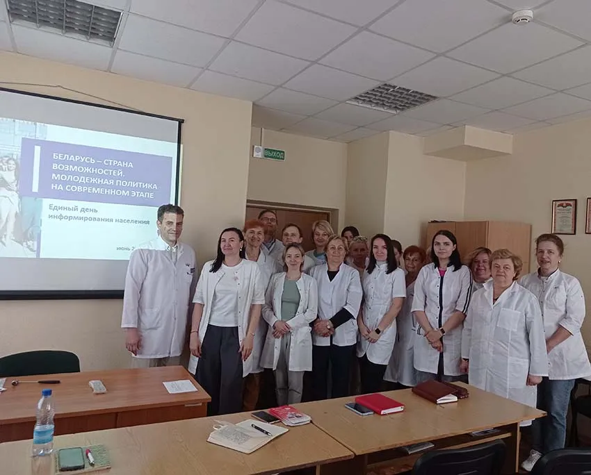 15.05.2025 заведующий кафедрой неврологии и нейрохирургии, д.м.н., профессор Пономарев В.В. и доцент Мазуренко Е.В. провели со слушателями и сотрудниками Единый день информирования по теме: Здоровая нация как основа развития Беларуси