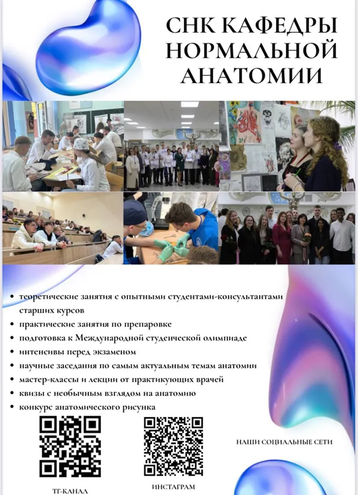 Основными задачами студенческого научного кружка (СНК) кафедры нормальной анатомии являются углубление знаний студентов о строении тела человека и раскрытие их потенциальных творческих способностей. Знания анатомического строения органов в повседневной работе врача оказываются более чем востребованными. В реализации этих задач в СНК практикуются четыре формы работы: теоретические занятия со студентами-консультантами, практические занятия (препарирование анатомического материала), выполнение научных исследований и факультативные занятия (подготовка к экзамену и олимпиаде по анатомии человека, факультатив по сердечно-сосудистой системе, центральной нервной системе и органам чувств и др.).
